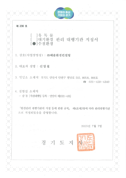 수질환경관리대행기관지정서