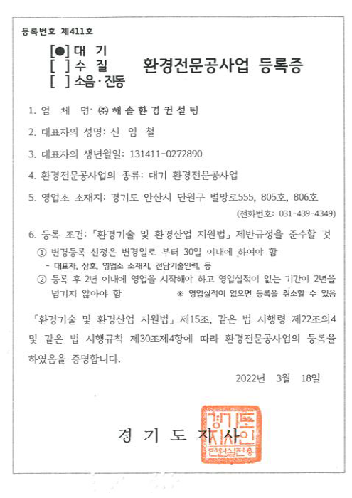 대기 환경전문공사업 등록증