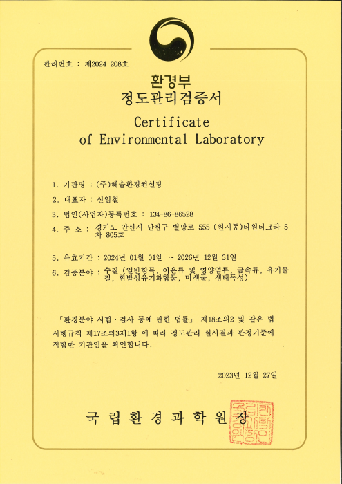 수질 정도관리 검증서
