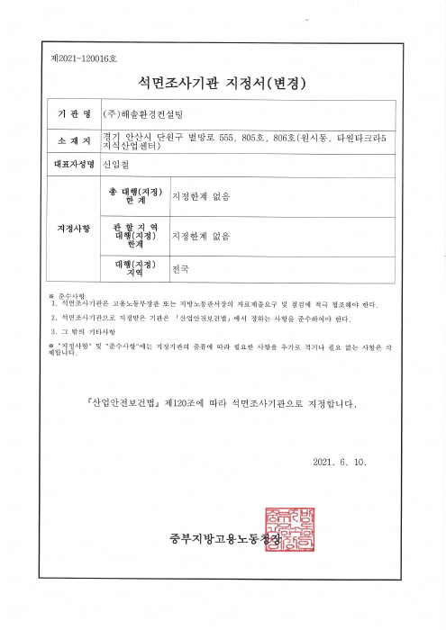 대기환경 관리 대행기관 지정서